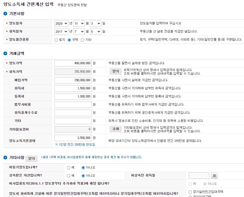 5. 이제 표에 필요한 숫자들을 입력해 봅니다. 양도일자, 취득일자, 양도가액, 취득가액 등을 넣습니다.(필수입력) 그 다음 상속재산인지, 주택수에 대한 세세한 정보들을 입력하고 세액 계산하기를 클릭하면 됩니다. 저는 아래처럼 입력했습니다.