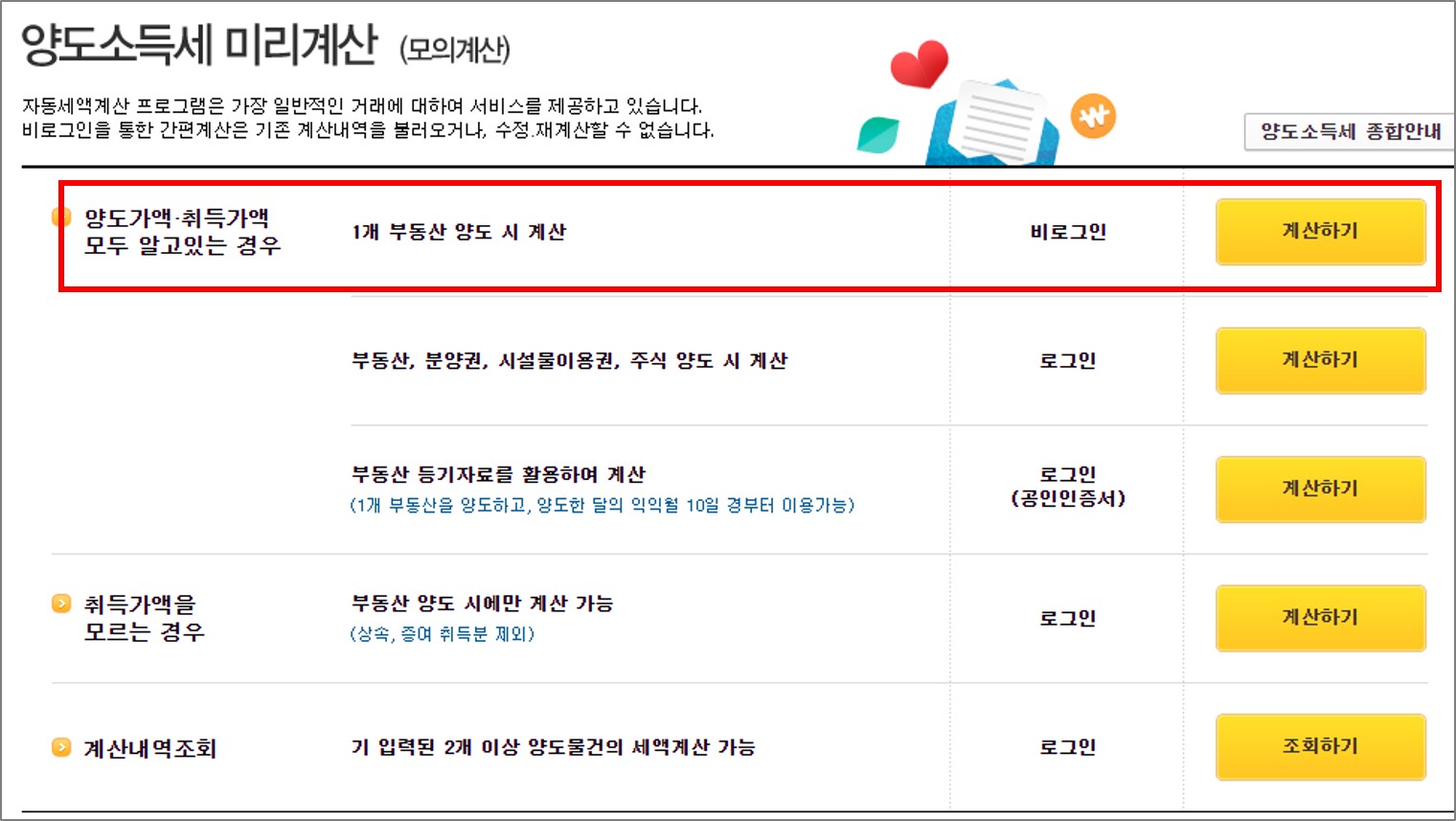 4. 여러가지 경우에 따른 모의 계산을 할 수 있습니다. 양도가액과 취득가액 모두 알고 있는 경우, 취득가액을 모르는 경우 그리고 부동산, 주식, 분양권 등에 대한 계산도 가능합니다. 이 중 양도가액과 취득가액 모두 알고 있는 경우의 1개 부동산 양도 시 계산만 비로그인 한 사람들도 이용할 수 있습니다. 그리고 보통 아파트 양도소득세 계산은 양도가액, 취득가액을 다 알고 있다고 생각해서 이 경우로 한번 해보겠습니다.
